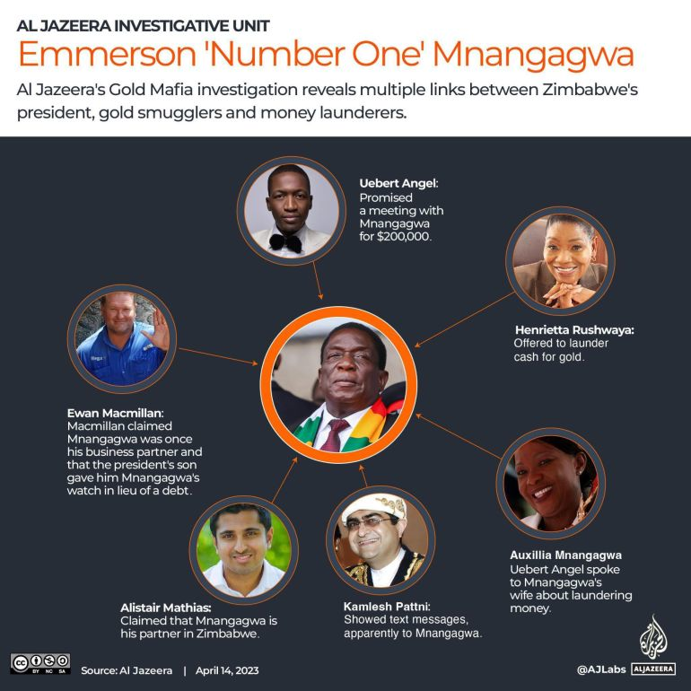 Al Jazeera’s investigative graphic mapping Zimbabwe’s Emmerson Mnangagwa’s alleged connections to gold smuggling and money laundering networks