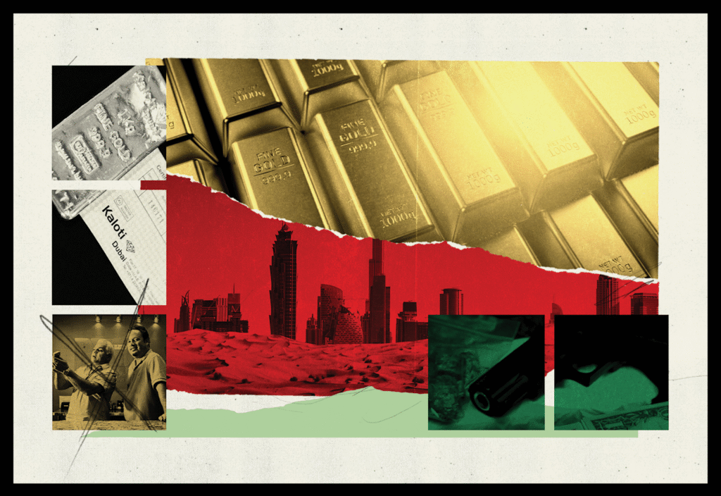 Composite image showing gold bars, Dubai cityscape, and crime-related visuals symbolizing illicit money laundering through the Dubai gold market