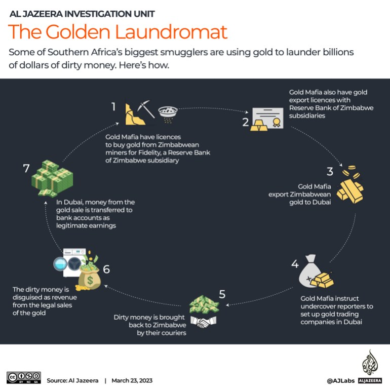 Infographic showing how the Gold Mafia launders dirty money through gold in Zimbabwe and Dubai following a seven-step process